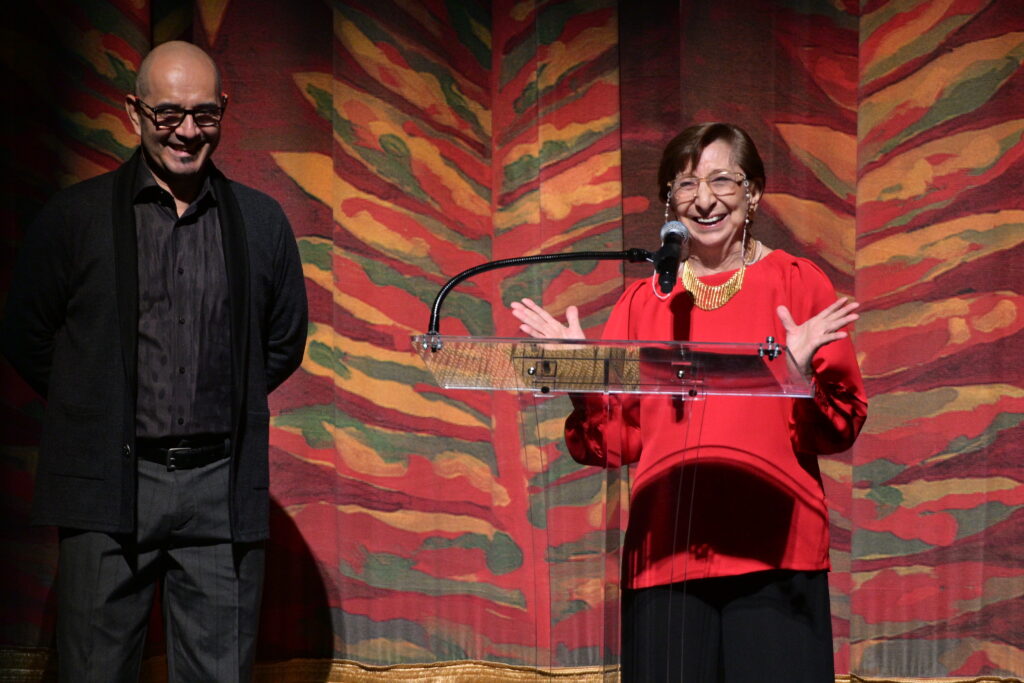 Eriberto Jiménez, director general del IBFM y Gloria Castro, Premio Una Vida por la Danza 2022, en el escenario del Arsht Center, al inicio de la Étoiles Grand Classical Gala del sábado 13 de agosto. Fotografía: Simon Soong (cortesía de Miami Hispanic Ballet / IBFM)
