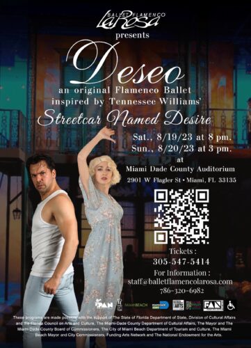 El estreno de “Deseo”, un ballet flamenco de Ballet Flamenco La Rosa, con coreografía de Ilisa Rosal y basado en el drama “Un Tranvía Llamado Deseo” de Tennessee Williams, tendrá lugar el sábado 19 de agosto a las 8 de la noche en el Miami-Dade County Auditorium (2091 W Flagler St. Miami, FL 33135). Una segunda función se ofrecerá el domingo 20 de agosto a las 3 de la tarde. Para adquirir entradas visitehttps://www.balletflamencolarosa.com/ o llame a (305) 547-5414