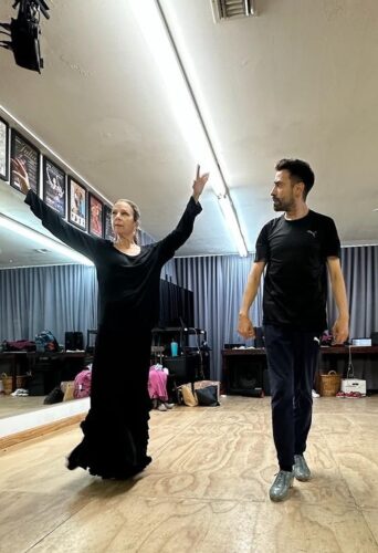 Ilisa Rosal con Armando Tovar en un ensayo de “Travesía”, la puesta en escena de Rosal inspirada en “Long Day’s Journey into Night”, que se estrenó en marzo de este año. Fotografía: Pilar Fernández (cortesía de Ballet Flamenco La Rosa)