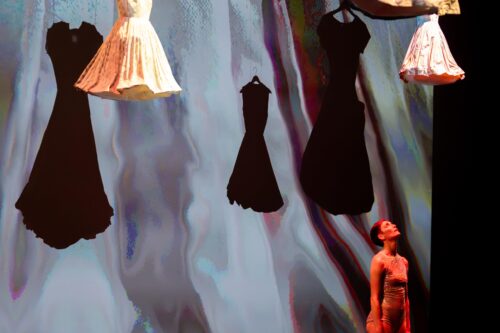 No es hasta las 8:15 pm que entran a escena los tres bailarines. Envueltos en trajes blancos voluminosos, atraviesan el espacio de derecha a izquierda y se detienen para quitarse los adornos de cabeza, que parecen ser nubes de algodón. Los guardan en una caja enorme. Se despojan también de sus trajes y quedan vistiendo solamente leotardos de danza que proyectan miles de pequeños destellos.