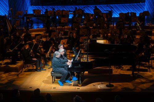 Michael Tilson Thomas y Jean Yves Thibaudet en el bis del concierto del 4 de mayo. Fotografía: Alex Markow (cortesía de la New World Symphony)