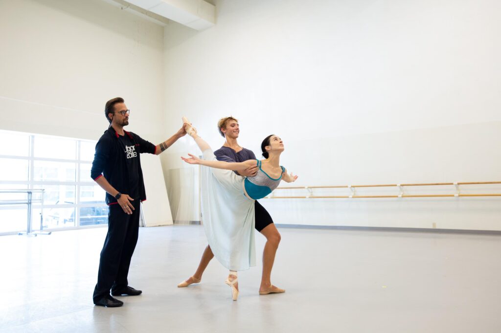 Isadora Valero y Books Landegger en ensayo con Filip Barankiewicz, que ha montado y dirigido ballets de John Cranko en numerosas compañías y se encuentra en Miami como entrenador invitado. Fotografía: Alexander Iziliaev (cortesía de Miami City Ballet)