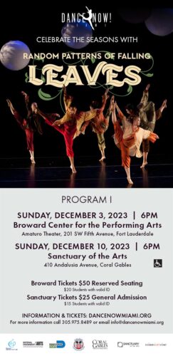 Dance NOW! Miami (DNM), bajo la dirección artística de sus fundadores, Hannah Baumgarten y Diego Salterini, presentará su primer programa de la temporada 2023-2024 en dos escenarios muy diferentes: el domingo 3 de diciembre en el Amaturo Theater del Broward Center for the Performing Arts (Fort Lauderdale) y el domingo 10, en Sanctuary of the Arts, en Coral Gables.