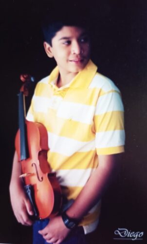 Su primer instrumento fue el cuatro, en sus propias palabras “una especie de ukelele venezolano”. Luego vinieron la mandolina, la guitarra, la flauta… hasta que se cruzó con el violín, un instrumento que admite “no sabía muy bien qué era”. Para Diego, lo importante era aprender a tocar. Su talento innato le permitió avanzar rápidamente y, pese a comenzar más tarde de lo habitual, se integró con naturalidad a la Orquesta Nacional Infantil de El Sistema.