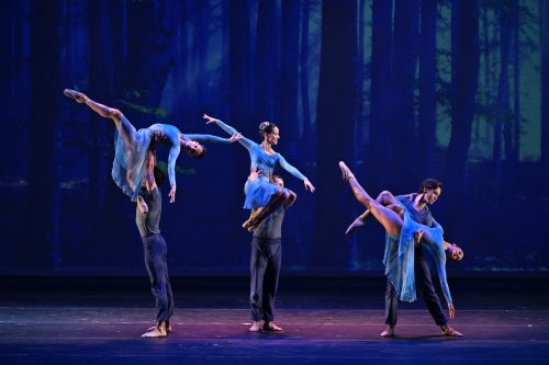 En la sección “Winter” del ballet “The Four Seasons” con coreografia de Yanis Pikieris: (de izquierda a derecha) Mayrel Martínez y Fabián Morales, Meisy Laffite y Stephan Fons, y Miranda Montes de Oca y Alexey Minkin. Fotografía: Simon Soong (cortesía)