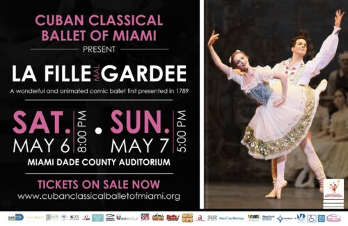 El Ballet Clásico Cubano de Miami (CCBM) presentará “La Fille mal Gardée”, el sábado 6 de mayo a las 8 de la noche y el domingo 7 de mayo a las 5 de la tarde. en el Miami-Dade County Auditorium (2901 West Flagler Miami 33135). Los boletos cuestan $65, $55 y $45. CCBM recomienda evitar comprar entradas de terceros y adquirirlos SOLO en su sitio web www.cubanclassicalballetofmiami.org o en la taquilla del teatro.