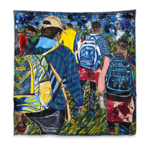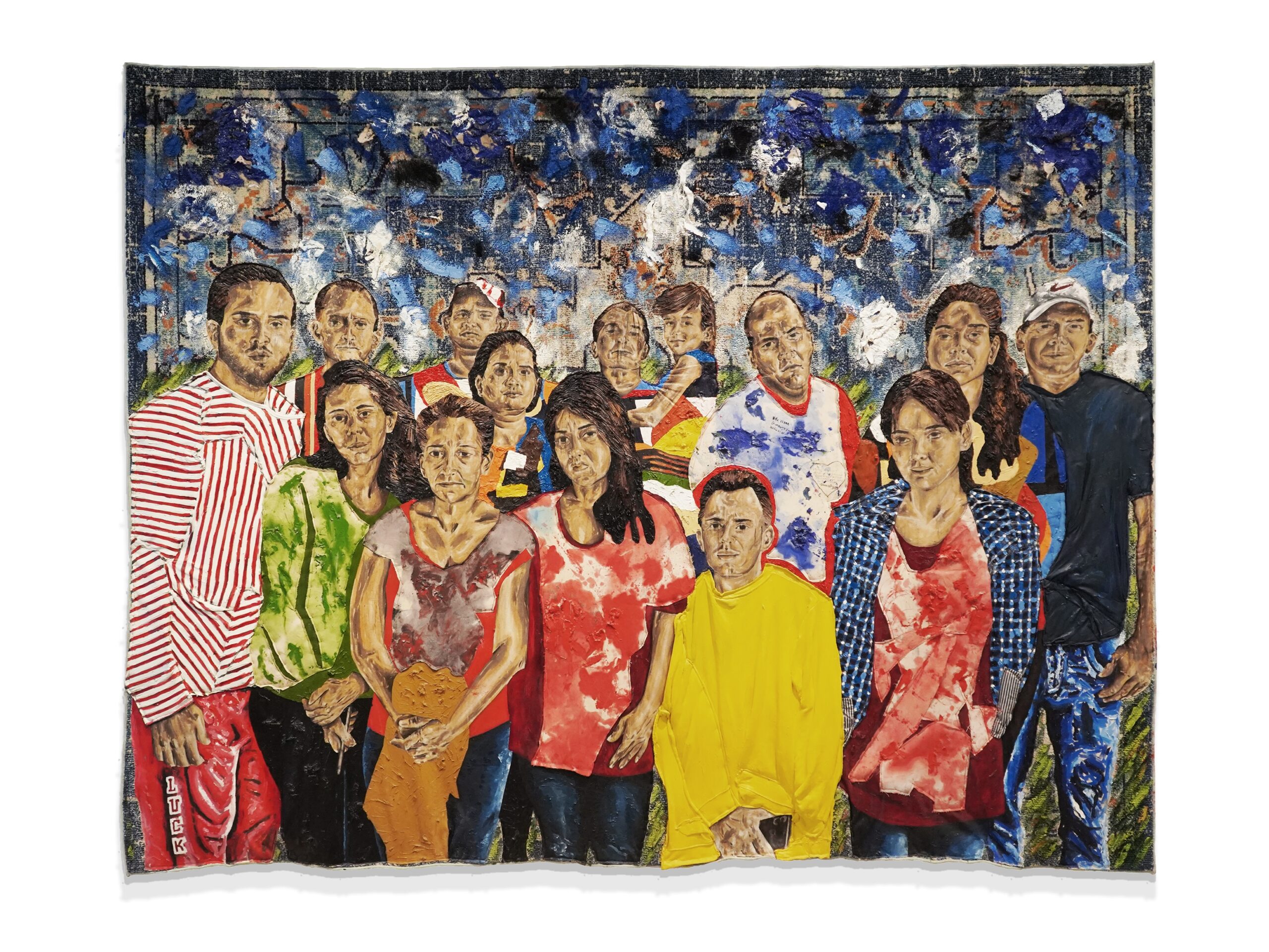 William Osorio, Los niños (de la serie The Path to the Volcanoes), 2024, óleo sobre lienzo con ropa reciclada, cosido a mano sobre alfombra, 79 x 79 pulgadas, 200,66 x 200,66 cm. Foto: Sofía Guerra, .(Foto: Sofía Guerra, Cortesía de LnS Gallery)