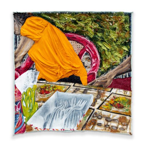 William Osorio, Tonalá (de la serie The Path to the Volcanoes), 2024, óleo sobre lienzo, ropa reciclada, textiles, flores secas y ratán cosido a mano sobre alfombra, 36 x 36 pulgadas, 91,44 x 91,44 cm. (Foto: Sofía Guerra, Cortesía de LnS Gallery)