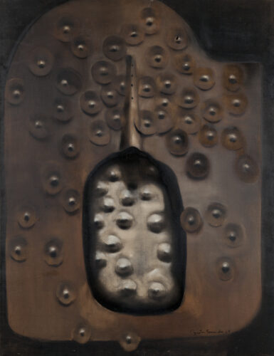 Agustín Fernández, “Escudo” (1964). Óleo sobre lino, 57 ¼ x 44 ¼ pulgadas. Cortesía de Elizabeth Levine, FIU 2003.54 Fotografía: Patricia & Phillip Frost Art Museum FIU (cortesía).