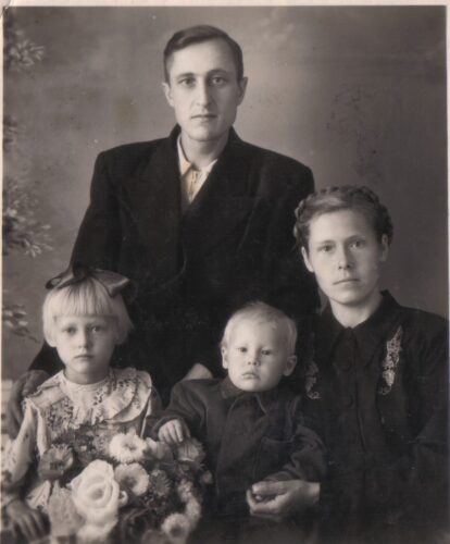 Foto familiar tomada en Biysk (c. 1957) junto a su padre Pedro, su madre Polina y su hermana Ludmila. Fotografía: archivo personal de V. Issaev (cortesía).