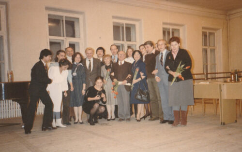 Graduación en GITIS (Moscú) en 1986. En la foto aparecen también sus maestros Vladimir Vasiliev, Ratislav Zaharov y Raiza Strutchkova. Fotografía: archivo personal de V. Issaev (cortesía).