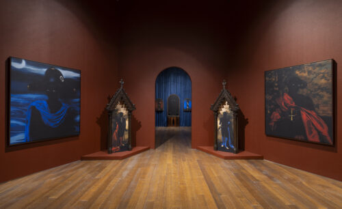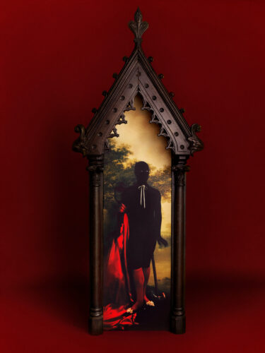 Elliot y Erick Jiménez. “One to Bind”, 2025. Impresión pigmentada de archivo sobre lienzo, instalada en un nicho gótico francés de roble del siglo XIX, de 213 x 84 x 61 cm. Fotografía: cortesía de los artistas y Spinello Projects.