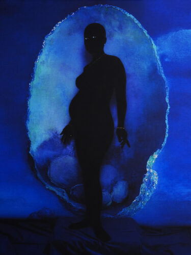 De apariencia similar son los rostros de, entre otras, las obras “El Monte (Ibejí)”, 2024, “The Incredulity of the Ibejí” de Elliot y Erick Jiménez, con la excepción tal vez de que aquí los ojos sí tienen expresión. Apariencia similar también tiene otra de sus obras, como “The Rebirth of Venus”, 2025, que invoca un cuerpo femenino en avanzado estado de gestación.