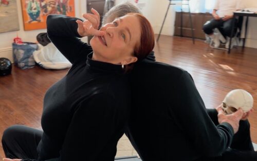 Lili Rentería en un ensayo con Juan David Ferrer. Rentería encarna el personaje de El Enterrador, para el que ha aprovechado lecciones aprendidas cuando hizo “Mariana” en La Habana de los 80 bajo la dirección de Roberto Blanco. Fotografía: Steven Salgado (cortesía de Miami Factory Theater).