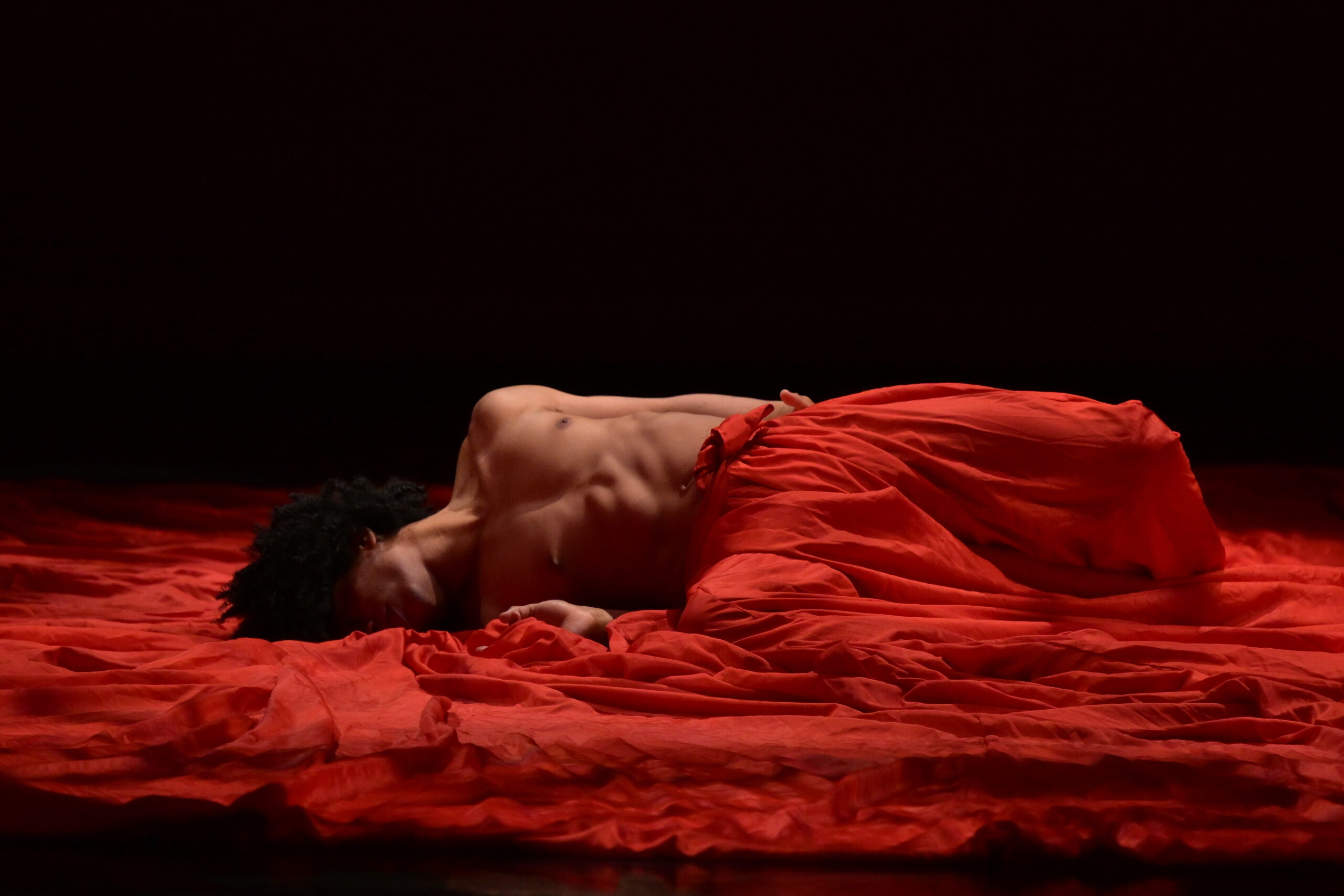 “Latente” es una propuesta sofisticada que abre de manera espectacular con la imagen de un bailarín de espaldas al público (Juan David Viveros), con el torso desnudo y manipulando una enorme falda roja.