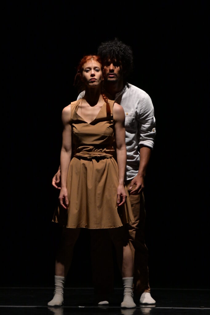 Por su parte, Octavio de la Roza y Camila Colella, trajeron un fragmento de la “Carmen” de Mauro Bigonzetti, cuya versión grabada estuvo entre lo mejor del XXV festival hace dos años, y un ejercicio de danza-teatro titulado “Volverá la Felicidad”, donde Octavio viste de blanco, canta, toca el acordeón y se pasea por la escena. Camila parece hacer tiempo esperando que se emborrache del todo. Cuando esto sucede, se le acerca y le quita la botella, le hace beber una última gota y dirige la mirada a las alturas.