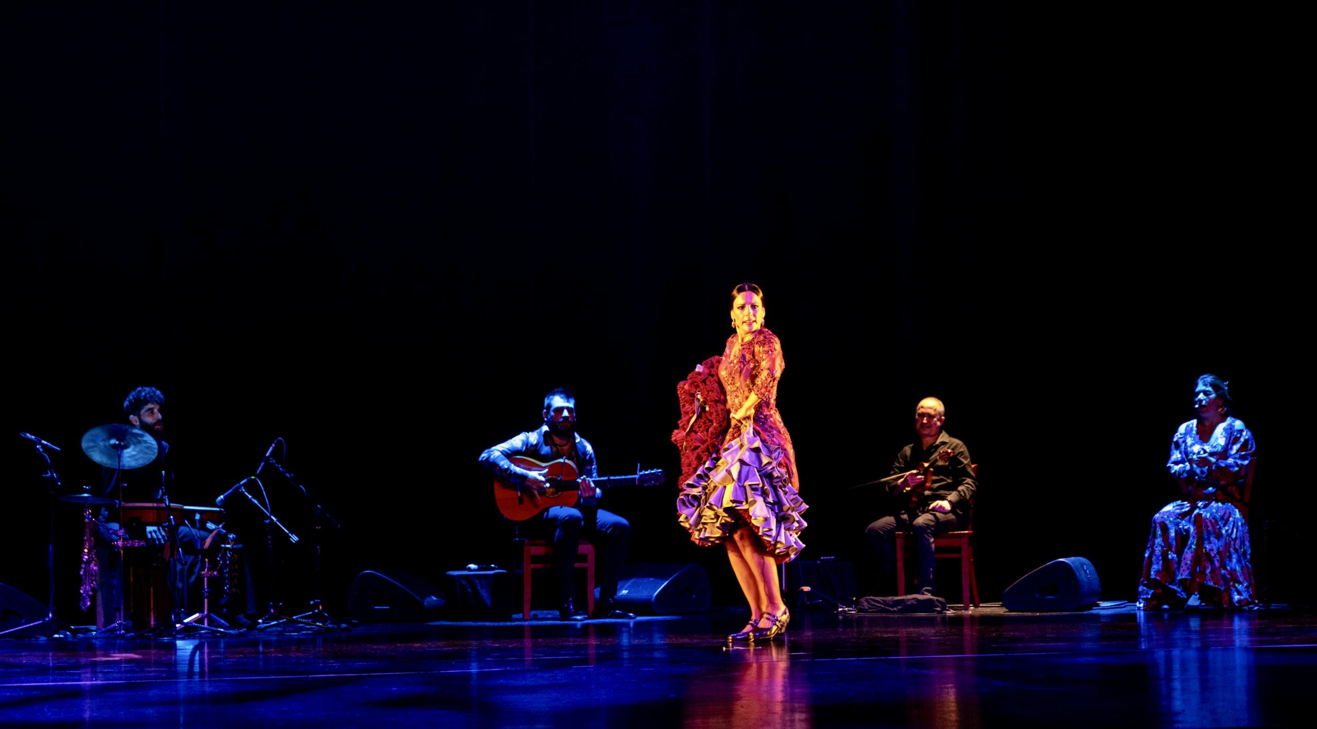 Lucía Ruibal (al frente) en “Alejandra”, acompañada (al fondo, de izquierda a derecha) por Epi Pacheco (percusión), José Almarcha (guitarra), Fernando Clemente (violín) y Fabiola Santiago (cante). Fotografía: Javier Labrador (cortesía de FUNDarte)