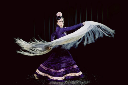 “En el tablao”, nos dice, “existe una intimidad y una espontaneidad difícil de conseguir en otro espacio. Para mí la principal diferencia es cómo manejar las energías, la mía propia, la de los músicos, la del público… En un teatro dependemos más de la parte técnica (las luces, el sonido) y es fácil que la energía se pierda y no llegue hasta la última fila de butacas. Pero también es cierto que el teatro te ayuda más a sumergirte en la historia que quieres transmitir, y espacialmente da mucha más libertad”.
