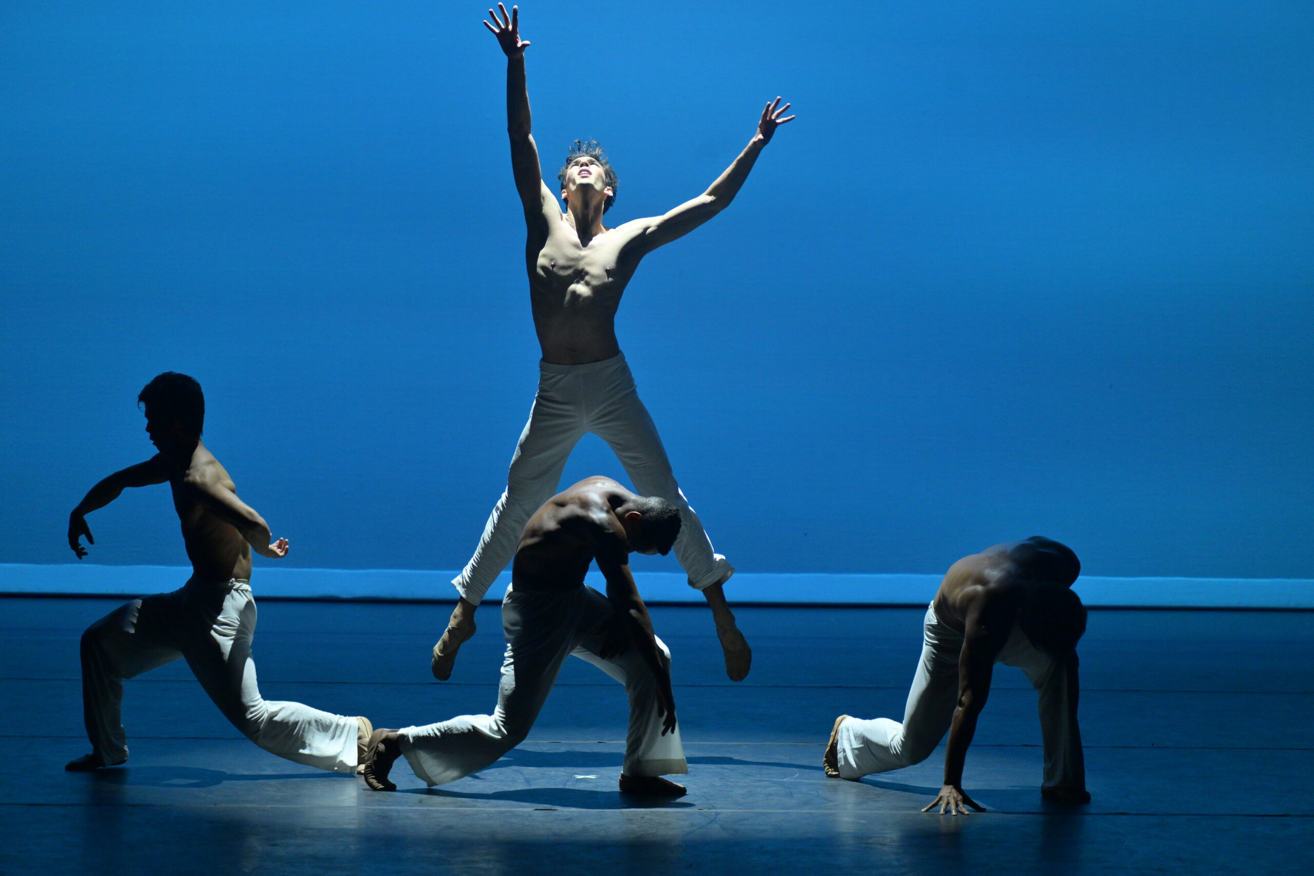 Los bailarines de Miami City Ballet (Satoki Habuchi, Rui Cruz y Andrei Chagas al frente, Ethan Rodriguez en el aire) en “Seven Days Walking”, de Nathalia Arja. Fotografía: Simon Soong (cortesía).