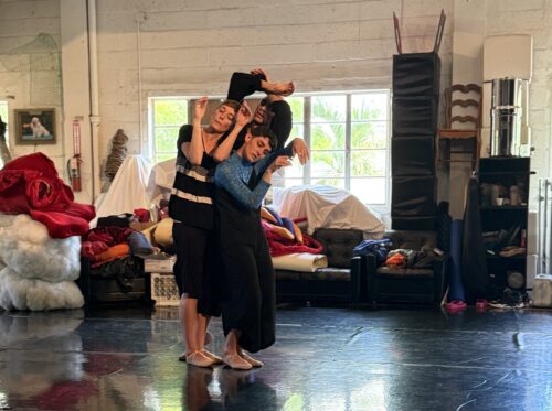 De izquierda a derecha: Amy Trieger, Isaiah González y Meredith Barton, bailarines de brigid baker wholeproject, en el 6th Street Dance Studio durante un ensayo de “GULF”, la obra más reciente de Brigid Baker. Fotografía: Salvador Gómez (cortesía).