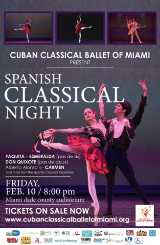 La Gala “Noche Clásica Española” del Ballet Clásico Cubano de Miami tendrá lugar el viernes 10 de febrero a las 8 de la noche en el Miami-Dade County Auditorium (2901 W Flagler St, Miami, FL 33135). Los boletos, con un precio de $35 a $65, pueden adquirirse en Ticketmaster.com, llamando al (305) 547-5414 o en la taquilla del teatro de lunes a viernes de 4 de la tarde a 9 de la noche.