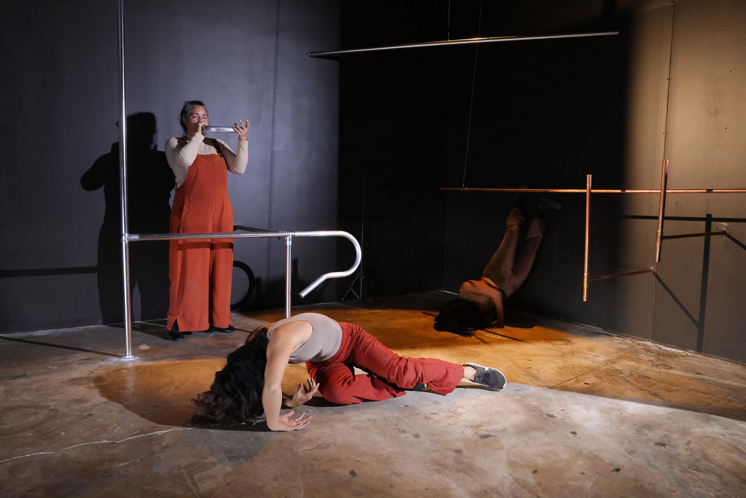 Roxana Barba, Performance de activación de la instalación “Oscilaciones”, 2025. El día 18 de enero, durante la inauguración de la muestra, las performers Betzabet Consuegra, Britney Tokumoto y Nicole Pedraza actuarán a partir del contacto con la pieza central de la exposición. Fotografía: Logan Fazio (cortesía).