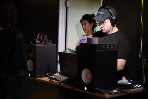 En primer plano, Andrew McLee, músico y colaborador en la creación de la instalación “Oscilaciones”; detrás, Roxana Barba. Fotografía: Logan Fazio (cortesía).