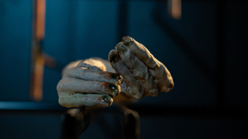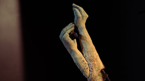 Roxana Barba, “Mientras vuelvo a cero” [Really Looking Forward to This], 2025. Escultura en cerámica (detalle). El cuerpo como fragmento o las manos de arcilla, pero integradas a la lógica de la máquina, son elementos recurrentes en la obra más reciente de la artista. Fotografía: Claudio Marcotulli (cortesía).