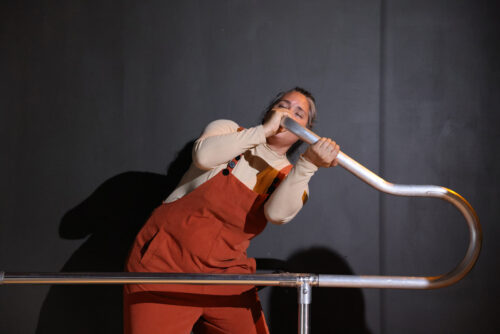Betzabet Consuegra sopla, roza, frota partes de la instalación de tubos metálicos de la pieza “Oscilaciones”, 2025. Esta escultura también es un gran instrumento musical que actúa como un potente activador de los sentidos en Under the Bridge Art Space. Fotografía: Logan Fazio (cortesía).