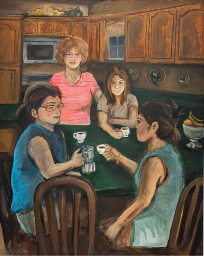Si las cerámicas de la muestra convocan, en tono elegíaco, recuerdos que fundan los valores de la familia como unidad ante la adversidad o el respeto a las iniciales de los orígenes, las pinturas también apuntan a estos sentimientos como sucede, por ejemplo, en “Ofelia” y “Soñando caña y café”. En ambos casos, las imágenes representan situaciones, momentos de la familia en los distintos lugares de la casa. Situaciones cotidianas como dormir, o reunirse en la cocina para desayunar. Son imágenes que parecen haber sido tomadas de fotografías, como documento que salva del olvido lo que ha sido.
