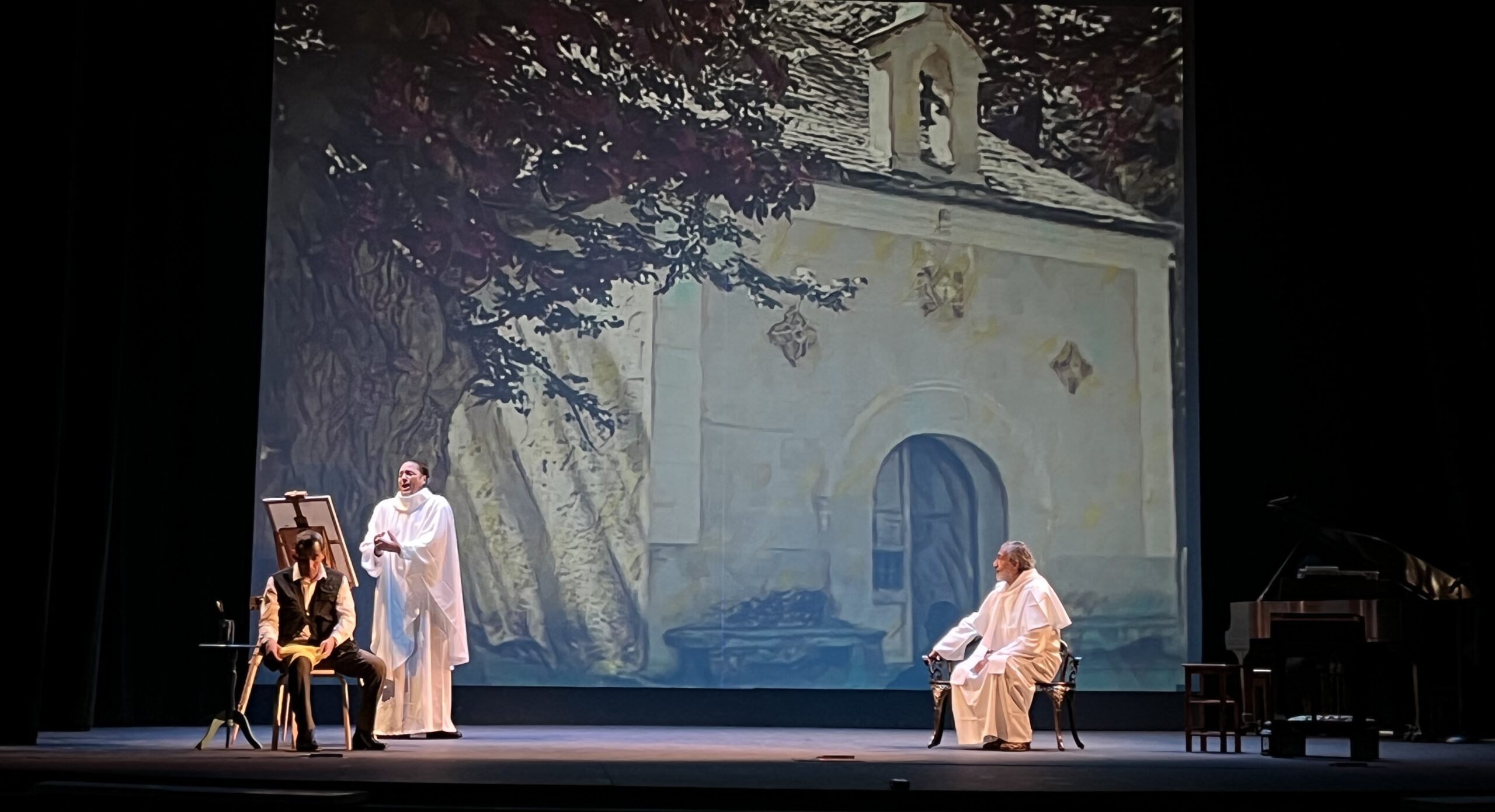 Rafael (Fer du Port) canta la romanza “La roca fría del Calvario” mientras Pablito (Karel Morell) y el Prior (Carlos Jimeno) escuchan. Fotografía: Julio Alejandro Rodríguez (cortesía de Zarzuela Inc.)