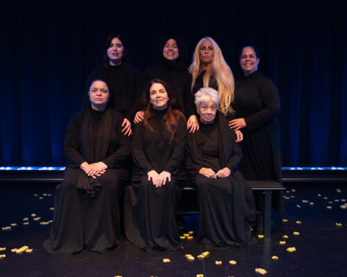 Las actrices de “Eva”. Ivanessa Rodríguez, Lilliam Vega y Flora Lauten (sentadas, de izquierda a derecha). Dianet Conde, Kirenia Vega, Fanny Tachin y Simone Balmaseda (de pie, de izquierda a derecha). Fotografía: Manuel Valladares (cortesía de El Ingenio Teatro).