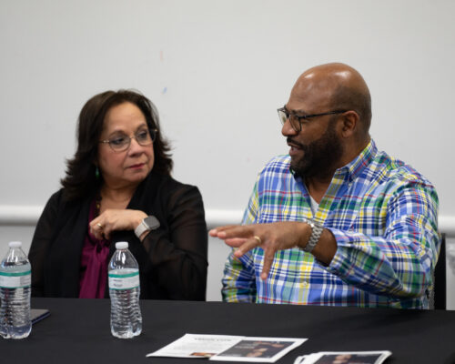 Mesa de teatro comunitario. Rosalba Rolón y Joel Almono (de izquierda a derecha). Fotografía: Manuel Valladares (cortesía de El Ingenio Teatro).