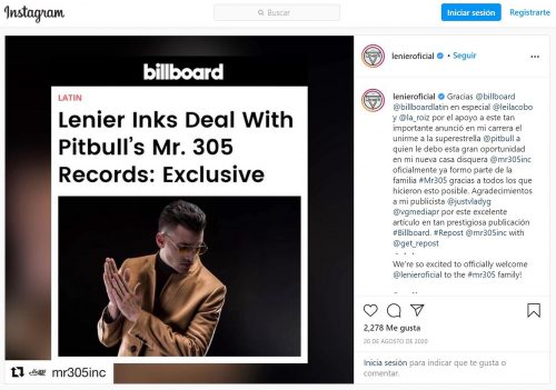 Mensaje de Lenier en Instagram el 20 de agosto del año pasado con la nota de Billboard que anunciaba su firma con la casa disquera de Pitbull. Fotografía: captura de pantalla.