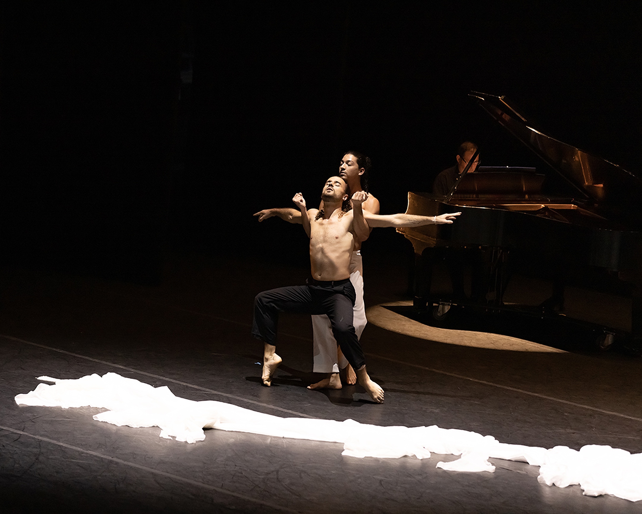 Los bailarines Raphael Ruiz y Jesús Sandoval (Cuban Classical Ballet of Miami) y Paul Schwarts (Florida Grand Opera) al piano, en “Addio” de Eriberto Jiménez. Fotografía: Yavi Reyes (cortesía de Inter-American Choreographic Institute)