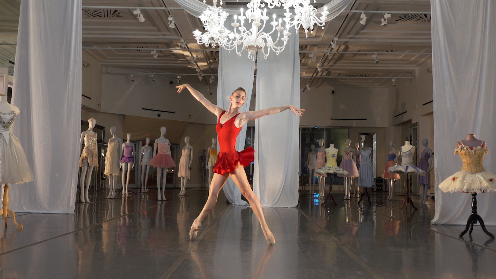 La toma aérea que se detiene sobre ella y los círculos dibujados en el piso frente a la vidriera de la que fuera la primera sede de Miami City Ballet, de repente nos hace recordar a “Los Paraguas de Cherburgo” de Jacques Demy. Aunque no esté lloviendo en Miami Beach y en lugar de parasoles de colores veamos palmeras tropicales. O que los paraguas de la pequeña boutique donde trabaja Catherine Deneuve en el filme de Demy hayan sido sustituidos por los trajes de las obras de repertorio de la compañía fundada en 1985 por Toby Lerner Ansen y Edward Villella.