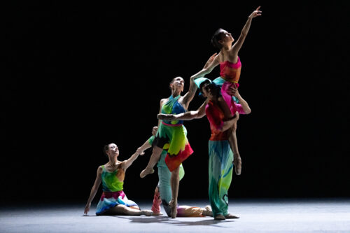 Los bailarines de Miami City Ballet (con Katia Carranza sostenida en lo alto por Shimon Ito) en “Petrichor”, de Pontus Lidberg. Fotografía: Alexander Iziliaev (cortesía de Miami City Ballet).