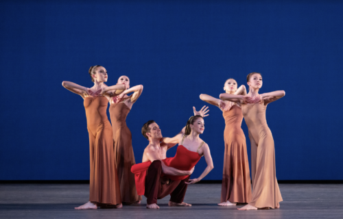 Los bailarines de Miami City Ballet (con Katia Carranza y Steven Loch al centro) en “Diversion of Angels”, coreografía de Martha Graham. Fotografía: Alexander Iziliaev (cortesía de Miami City Ballet).