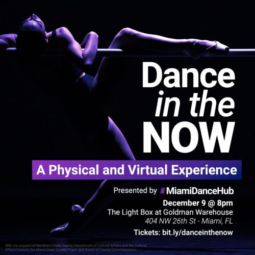 “Dance in the Now: A Physical and Virtual Experience” se presenta el jueves 9 de diciembre a las 8 de la noche en The Light Box en Goldman Warehouse (402 Northwest 26th Street, Miami, FL 33127). Cada boleto de $20 incluye una bebida gratis y acceso para ver la clase de calentamiento y los preparativos detrás del escenario (comenzando a las 6:30 de la tarde). Los boletos pueden adquirirse