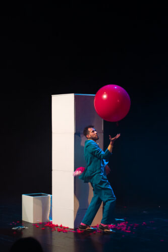 Fernando Leija Flores y el globo rojo de “Miedo come todo… sueños al vuelo”. Fotografía: Javier Coello (cortesía de FUNDarte)