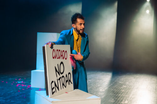 Fernando Leija Flores le muestra al público el letrero que antes había ignorado en “Miedo come todo… sueños al vuelo”. Fotografía: Javier Coello (cortesía de FUNDarte)