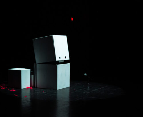 El cubo “que sonríe” y aparenta musitar una canción de Nino Rota en “Miedo come todo… sueños al vuelo”. Fotografía: Javier Coello (cortesía de FUNDarte)