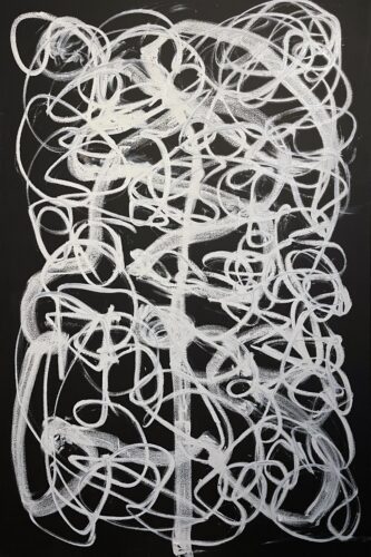 Orlando Urdaneta. Residencia T 1, 2025 (Serie Garabatos). Acrílico y óleo pastel sobre tela, “71 ½ x 47 ½”. Fotografía: cortesía del artista.