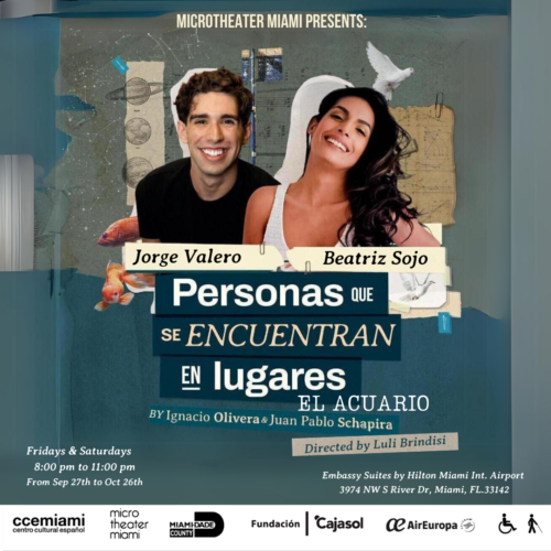 Del 27 de septiembre al 26 de octubre, Microteatro del Centro Cultural Español (CCE), viernes y sábados de 8:00 pm a 11:00 pm en cuatro salones del Hotel Embassy Suites, en las inmediaciones del Aeropuerto Internacional de Miami: cuatro obras cortas, “creadas exclusivamente para el formato del microteatro”, dice Mayte de la Torre, la directora del Centro: “Personas que se encuentran en lugares. El acuario”, “Dulce aguacero”, “Swipeyland” (en inglés) y “Contracciones”.