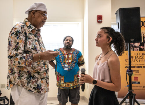 Chucho Valdés trabaja con estudiantes de secundaria como parte del programa Arsht Center Jazz Roots Soundcheck. Fotografía: Daniel Azoulay (cortesía de Arsht Center)