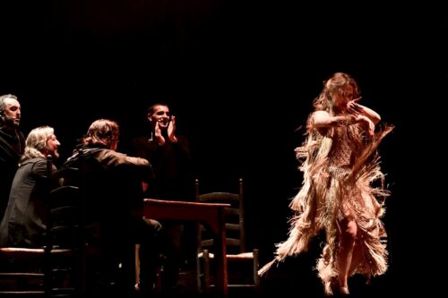 Siudy Garrido y los músicos en un momento de “Bailaora, Mis Pies Son Mi Voz”. De izquierda a derecha: Manuel Gago, Juan Parrilla, Jose Luis de la Paz (de espaldas), Ismael Fernández y Siudy Garrido, con el vestido creado para ella por Andrea Almeida. Fotografía: Carlos Manuel Oyón (cortesía de Siudy Flamenco)