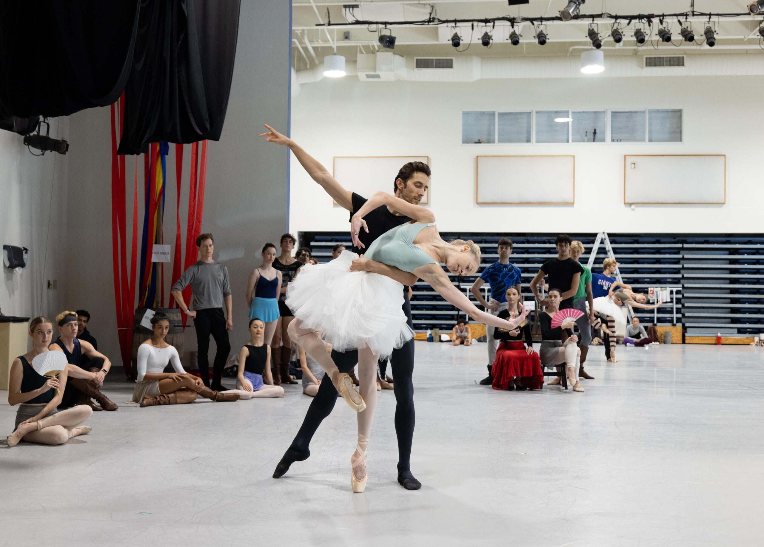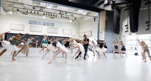 Los bailarines de Miami City Ballet ensayando ensayando “El Lago de los Cisnes” de Alexei Ratmansky. En el centro, Stanislav Olshanskyi y Dawn Atkins. Fotografía: Alexander Iziliaev (cortesía de Miami City Ballet).