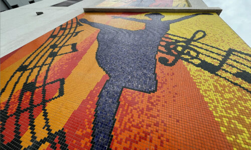 Latimore used a multiplicity of colored mosaic glass tiles from Artaic to represent the vibrant community in and around the Audrey M. Edmonson Transit Village and adjacent Sandrell Rivers Theater in Miami’s Liberty City neighborhood.