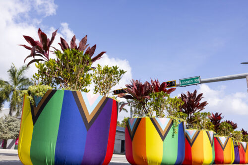 Concrete planters wrapped in the rainbow flag colors border Lincoln Road on Washington Avenue, Alton Road, and Euclid Avenue. Photo credit Fotonoggin.