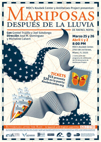 El estreno de “Mariposas después de la lluvia” de la inspiración del dramaturgo argentino Rafael Nofal en la sala del Koubek Center con funciones el 25 y 26 de marzo, repitiendo el viernes y sábado de la semana siguiente, corona los esfuerzos de 10 años de trabajo de Antiheroes Project, una organización sin fines de lucro, dedica a la creación, promoción, difusión y preservación del teatro en español en Miami.